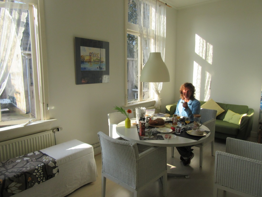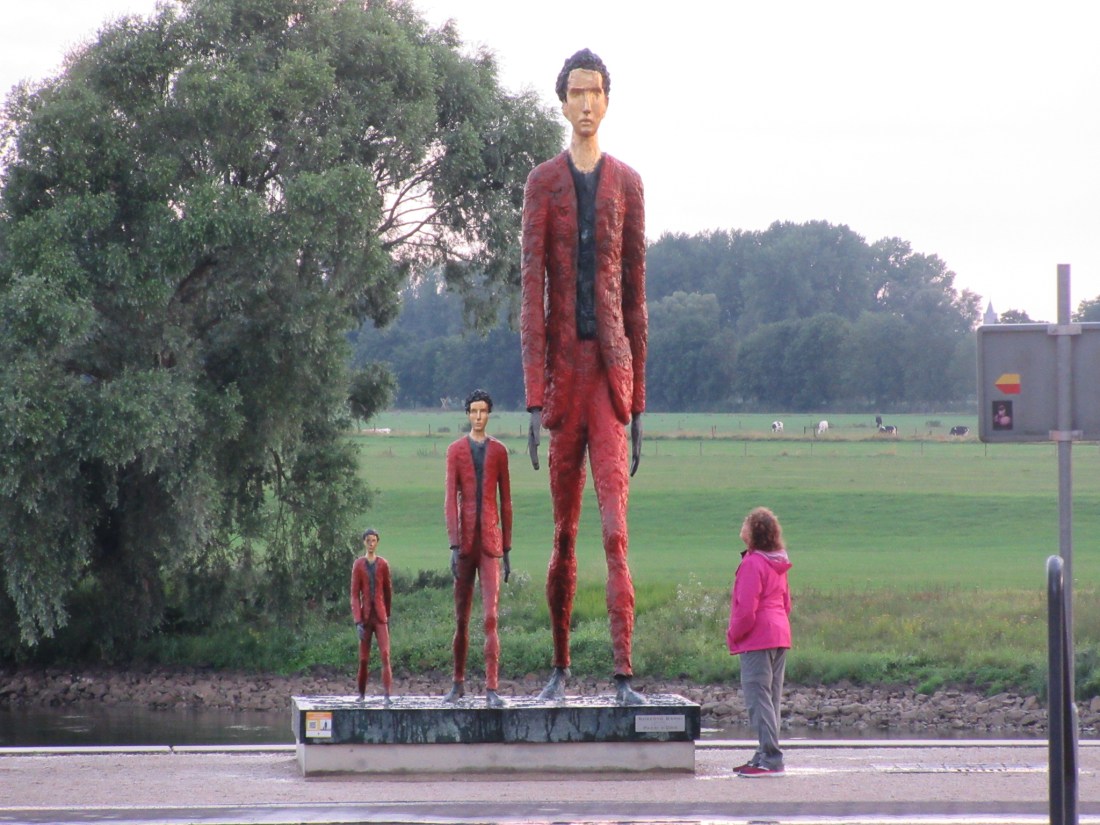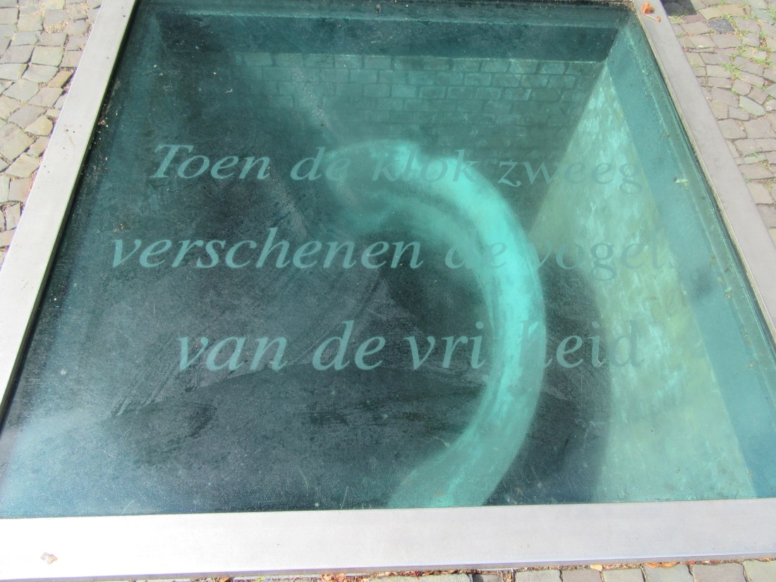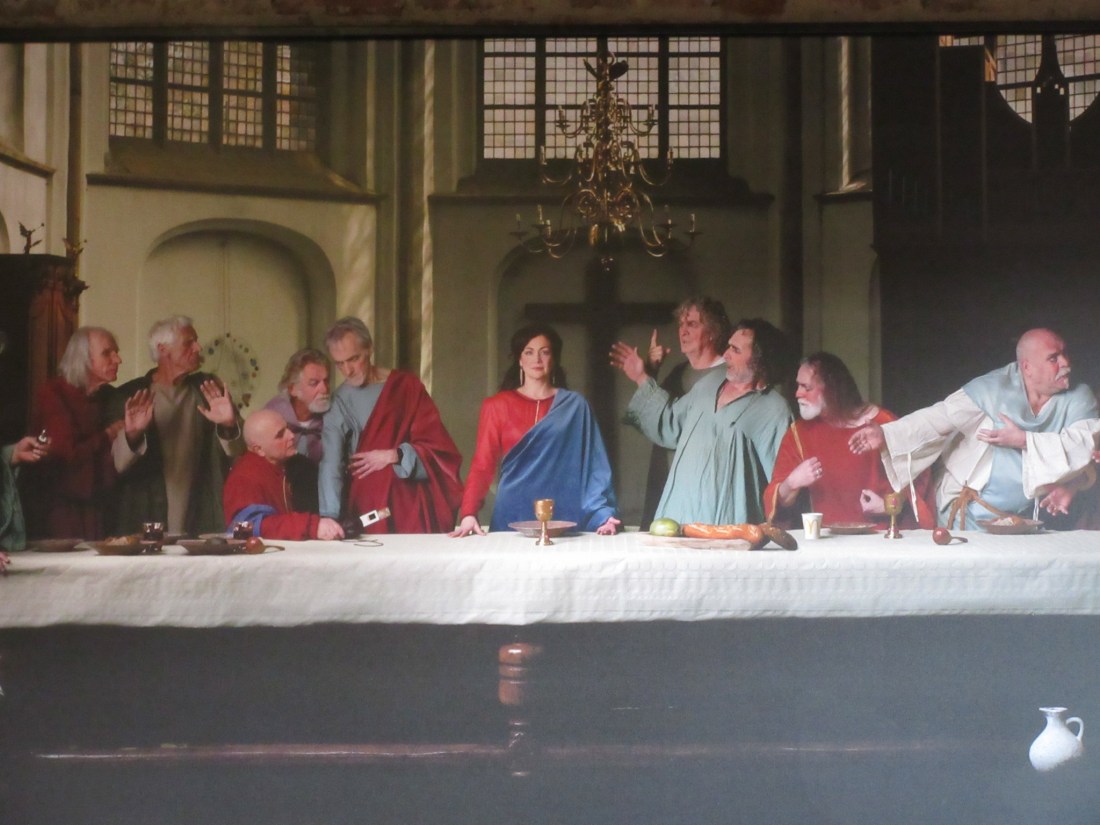 The ground floor of the B & B where we stayed, was our host’s clothing design studio.Sunlit breakfast room.The way to our living quarters for three nights. Holland has very steep and narrow stairs since they are often space deprived.The oldest restaurant in the Netherlands, operating since 1448. Food was great, too!Biked for two days while in Doesburg. Sometimes on dykes above the farms and sometimes on beautiful paths like this one.At one point we had to ferry across the river Ijssel. About a five minute journey😉This was an interesting sculpture. We first spotted it when crossing an arched bridge. So we were looking at it in the distance and from a bit above. It looked just like the figures were following each other. But when we walked up to it, they were next to one another. A very interesting optical illusion.This bell blown from the church tower by the Nazis in 1945, near the end of WWII. The inscription (loosely translated) is “When the clock stopped the bird of freedom flew”.Another night, we were in a restaurant where this was hanging. The waitress told us that it was a photograph and actual townspeople had posed for it. I love that “Jesus” is a woman.