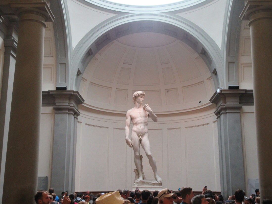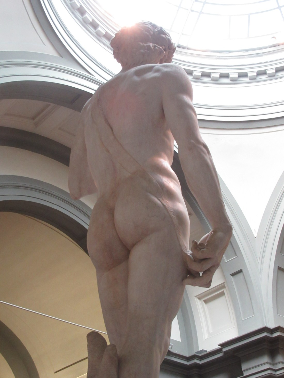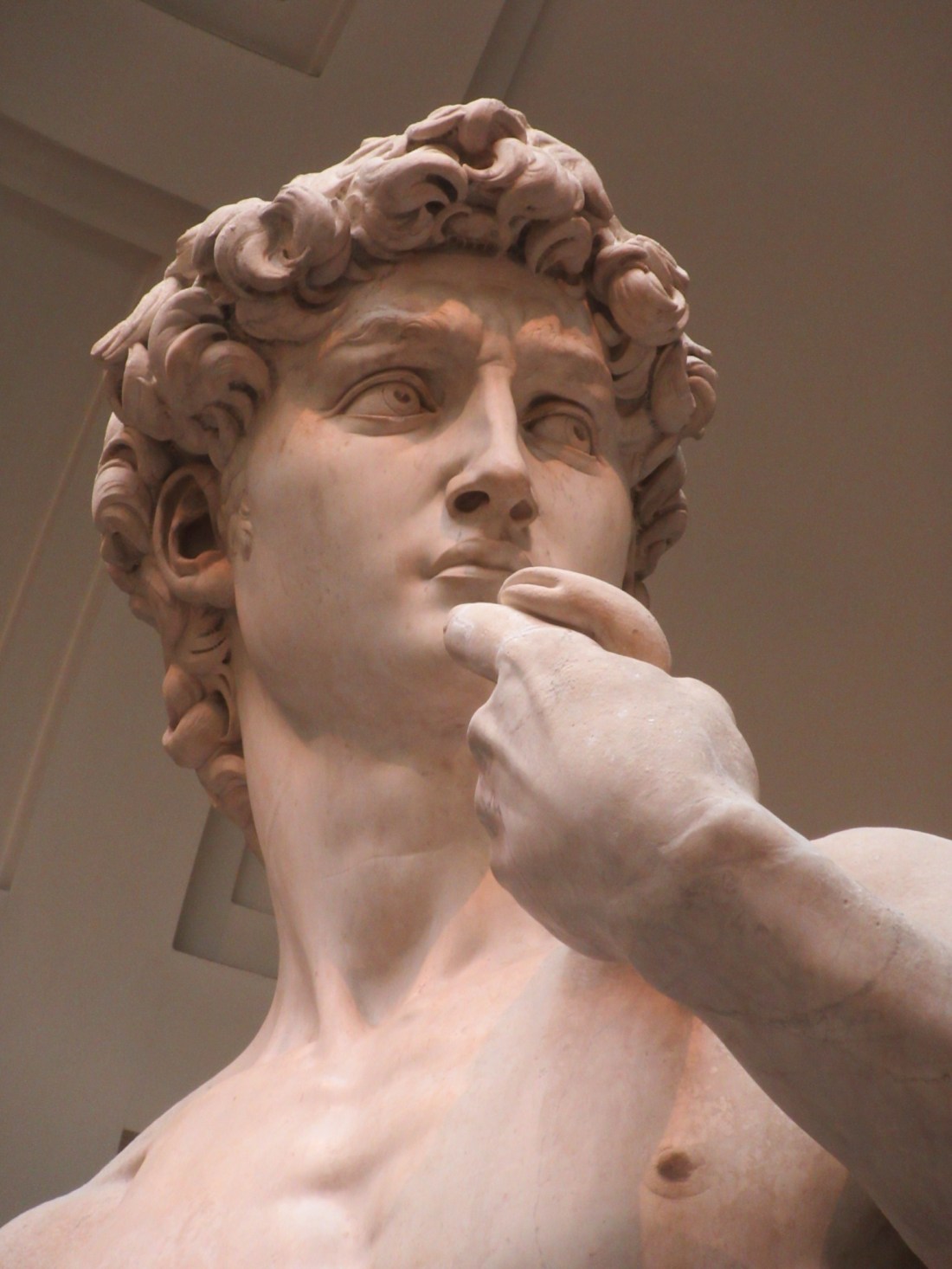Michelangelo (26 years old) was given a block of marble that other sculptors had rejected as too tall, shallow, and flawed to be of any value.But Michelangelo picked up his hammer and chisel, knocked a knot off what became David’s heart, and started to work.The statue captures David as he’s sizing up his enemy. He stands relaxed but alert, leaning on one leg in a classical pose known as contrapposto.In his powerful left hand, he fondles the handle of the sling,ready to fling a stone at the giant.His gaze is steady – searching with intense concentration, but also with extreme confidence.Michelangelo has caught the precise moment when David is saying “I can take this guy.”David is the symbol of Renaissance optimism. He’s not a brute. He’s a civilized, thinking individual who can grapple with and overcome problems. He needs no armour, only his God-given physical strength and wits.