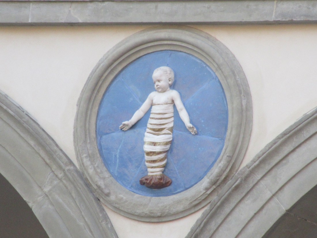 Back in the 1400’s it was believed that for the first year a baby should be wrapped in order for it’s spine to develop properly. There were many of these painted terra cotta medallions by Luca delle Robbia showing different ways to wrap babies.