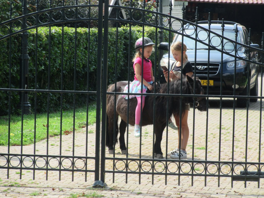 I found this interesting and a little sad. Older sister taking her little sister out on the pony but check out what she’s holding.